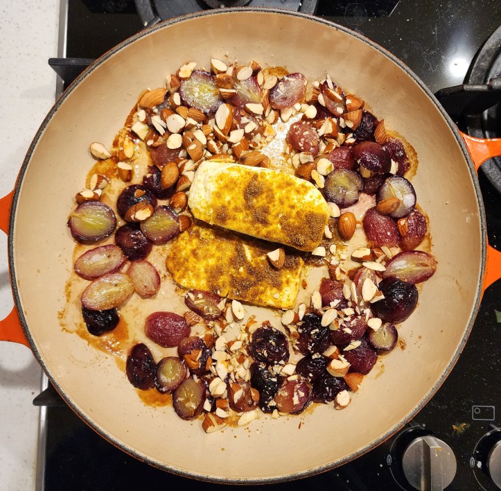 When the grapes are nicely starting to roast, remove the dish from the oven and add your feta. This can go in whole, no need to chop it up. Then coat the feta with a generous dusting of ground cumin. Aside from a bit of black pepper, this is the only spice flavouring the dish, so you don’t want to be stingy. You’ll want plenty of that delicious, warming taste.